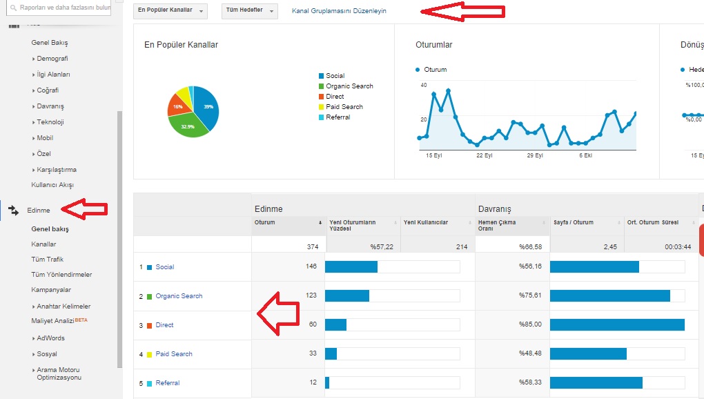 Edinme: Bu kısımdan blogunuza gelen trafiğin hangi kanallardan geldiğini kontrol edebilirsiniz. Ayrıca hangi anahtar kelimeler ile blogunuza giriş yapıldığını da analiz edebilirsiniz.