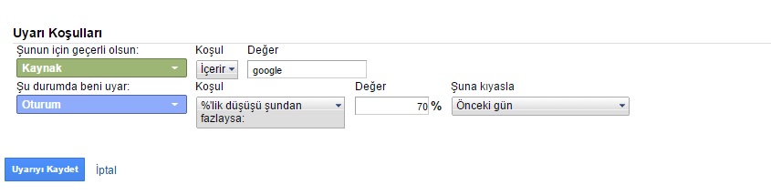 Yukarıdaki ayarları girdikten sonra yapmamız gereken nasıl bir uyarı girmemiz gerektiğine karar vermek olmalıdır. İlk örneğimizde eğer o gün sitenize hiç ziyaret gelmemişse nasıl bir ayar yapmanız gerektiğini anlatalım.