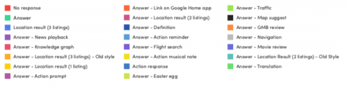 Okumak biraz zor olsa da, yukarıdaki grafikteki kırmızı çubuklar, sorgunun yanıtsız olarak yerine getirildiği örnekleri temsil etmektedir. Restoranlar, en küçük yanıtsız yüzdesine sahip kategorisindeyken, “aktarım”, yanıt vermeyi başaramayan sorguların en yüksek yüzdesine sahipti. Aşağıda, ROAST’a göre verileri veya cevap kaynaklarını gösteren bir renk skalası verilmiştir: