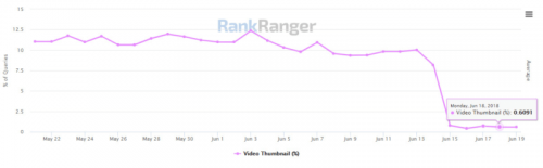 RankRanger, “Video küçük resimleri, tüm sayfaların yalnızca% 0,8’inde göründüğü noktaya düşmüştü. Bu,% 92’lik kayda değer bir düşüş.” Eski formatlı video küçük resimlerinin damgasını gösteren izleyici aracının ekran görüntüsü :